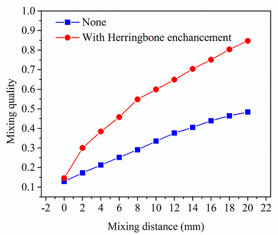 Comparison of mixing quality with and without herringbone structure. Red is the mixing quality along the main channel with herringbone enhancement, while blue is the mixing quality without any enhancement pattern.