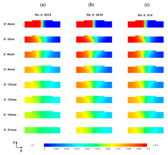 The concentration profiles along the main channel for various Re, (a) (Re = 0.0016); (b) (Re = 0.0035); (c) (Re = 0.014). The uniformity of the color represents the mixing performance.