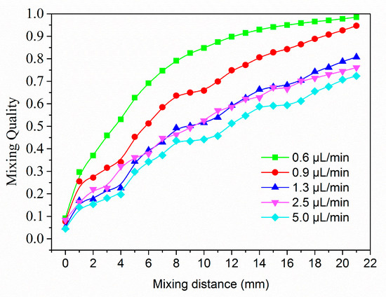 Comparison of the mixing quality along the mixing main channel under various flow rate.
