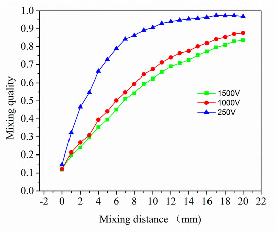 Comparison of mixing quality in Electro-osmotic flow (EOF) along the main channel with three electric potential: 250 V, 1000 V, 1500 V.
