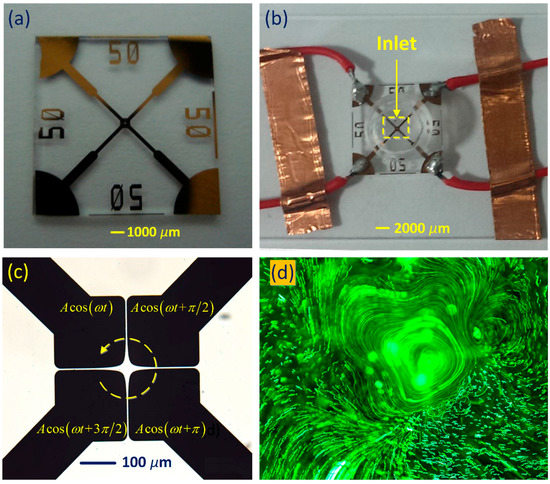Experimental setup of the microfluidic chip for studying the behavior of electrothermal flow in a rotating electric field (ROT-ETF). (a) An optical micrograph of the four-phase polynomial electrode configuration employed in this work; (b) A picture of the experimental microfluidic device where Plant Design Management System (PDMS) microchamber is plasmally bonded to the glass substrate with desired circulating electrode patterns; (c) Schematic of the applied 90°-phase-shifted sinusoidal voltage waves that produce a counterclockwise rotating electric field above the cross-shaped interelectrode gaps; (d) The fully-developed co-field TWET induction whirlpool above the electrode array at the Debye frequency of electrolyte suspension.