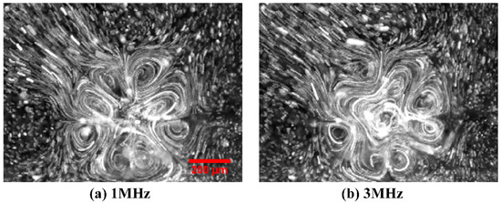 We take consecutive snapshots with a high-speed charge-coupled device (CCD) camera (RETIGA2000R, Qimaging, Surrey, Canada) and then superimpose the image frames in a software called ImageJ. The experimental images with particle streamlines due to superimposition operation are shown in Figure 1d and Figure 2. Horizontal rotating speed of latex beads due to the action of out-of-phase TWET streaming is calculated manually by dividing the physical distance moved for a particle by the time elapsed under the assistance of ImageJ software, with the measurement results shown in Figure 6a,b. The standard deviation for each data point was obtained by five repeated measurements under the same experimental conditions.