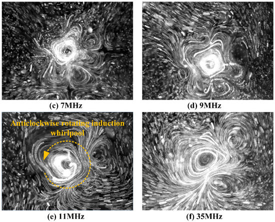 Frequency-dependent flow field of ROT-ETF captured in experiment using a high-speed CCD camera, for given voltage amplitude A = 7.5 V. (a) f = 1 MHz; (b) f = 3 MHz; (c) f = 7 MHz; (d) f = 9 MHz; (e) f = 11 MHz (relaxation frequency of the dielectric dispersion); (f) f = 35 MHz. With increasing field frequency beyond the reciprocal charge relaxation time, rotating streamlines of the anticlockwise induction whirlpool become more circular and less helically cascading downward.