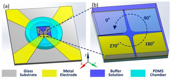 We fabricate the 4-quadrant electrode array for studying ROT-ETF by standard microelectronic technique. After finishing the design of photo mask, EPG533 photoresist layer (Everlight Chemical Industrial Corporation, Taiwan) is spin-coated on a glass slide, which then experiences Ultraviolet (UV) light exposure, development and post-baking in sequence. Subsequently, a 10 nm-thick Cr layer and 100 nm-thick Au layer are magnetically sputtered onto the photoresist pattern one by one. A lift-off process is carried out to obtain the final pattern of metal electrode layer on the glass substrate. At the same time, a Plant Design Management System (PDMS) microchamber is fabricated using standard soft lithography technique, and assembled onto the glass base with polynomial electrode patterns by plasma bonding, eventually giving rise to the microfluidic chip employed in current work, as shown in Figure 1.