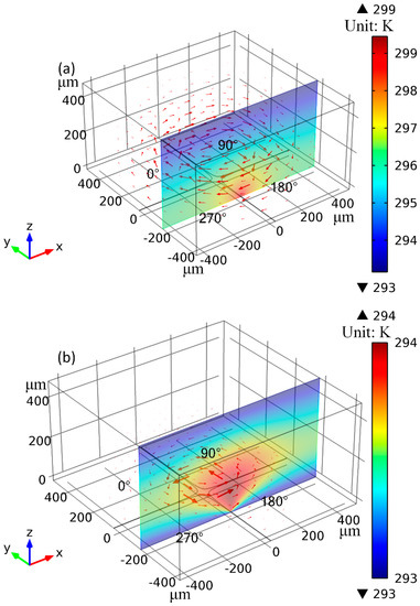 Figure 4 illustrates the simulation results of temperature field as well as the ACET flow field, by calculations using different thermal conjunction conditions (including the non-cooling and electrode cooling conditions indicated in Section 2.5) at the electrode surface. Gonzales et al. [41] derived self-similar analytical solutions of rotating electrothermal flow field in an ideally vertical temperature gradient caused by external illumination. The temperature field due to internal Joule heating is of a radial pattern (Figure 4), however, so it is reasonable to analyze Joule-heating-induced ROT-ETF by direct numerical simulation.