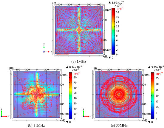 In the presence of electrode cooling, electrothermal flow profiles at different field frequencies are calculated by conducting numerical simulation, as shown in Figure 5. There are eight vortex flows in perpendicular orientation to the electrode plane at f = 1 MHz (Figure 5a), with flow patterns in good accordance with experimental observation in Figure 2a. Since f = 1 MHz is much lower than the medium charge relaxation frequency fc1 = 11 MHz, the multiple small in-phase SWET micro-vortices rotating orthogonal to the electrode surface are induced by the oppositely polarized electrodes with 180° phase difference and dominate over the horizontal out-of-phase TWET vortex. In Figure 5b, one large induction whirlpool is generated at the relaxation frequency, and it is not possible to find the vertical SWET flow components any longer. The out-of-phase induction vortex cascades downward with a helix flow profile, which coincides well with our experimental measurement in Figure 2e. According to simulation result in Figure 5c, the electrothermal flow field is completely stipulated by the horizontal out-of-phase TWET whirlpool at f = 35 MHz, with quite circular rotating streamlines. Since the field frequency 35 MHz surpasses the characteristic crossover frequency = 24.6 MHz for SWET, the SWET flow component in perpendicular orientation to the electrode plane decays considerably compared to the low-frequency limit, that is, the horizontal co-field TWET whirlpool governs the electrothermal flow field within the entire fluidic chamber at such high field frequencies. Consequently, the rotating electrothermal streamlines seem no longer to spiral downward, which can be validated by the experimental observation in Figure 2f as well.
