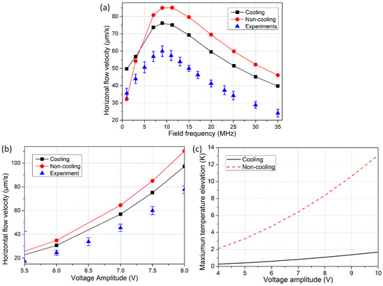 Comparison of electrothermal flow velocity and temperature elevation between theory and experiment for both cooling and non-cooling cases. (a) Frequency-dependence of maximum horizontal flow velocity; (b) Voltage-dependence of maximum horizontal flow velocity; (c) Voltage-dependence of maximum temperature rise within the medium bulk.