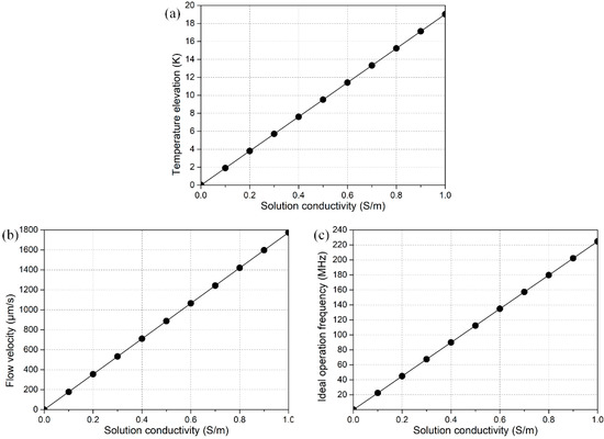 As shown in Figure 7, raising the electrical conductivity of buffer solution would increase the internal heating (, Figure 7a), and thereby result in acceleration of electrothermal fluid motion in rotating electric fields (, Figure 7b), while with a compromised trade-off in a sharp increase of the ideal operation frequency f = σ/2πε of the microfluidic device (Figure 7c), which poses a higher demand for the effective working frequency range of the multiphase function generator.