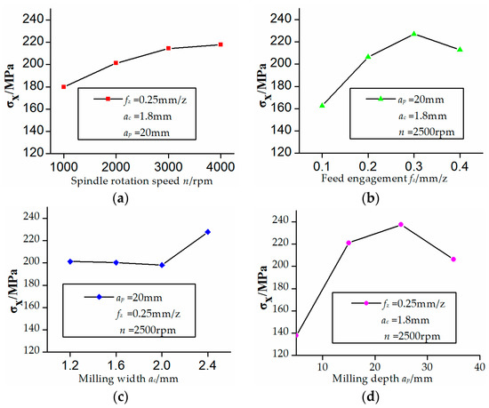 Effects of control factors on X-direction residual stress. (a) Relationship between spindle rotation speed and residual stress; (b) Relationship between feed engagement and residual stress; (c) Relationship between milling width and residual stress; (d) Relationship between milling depth and residual stress.