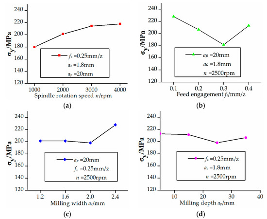 Effects of control factors on Y-direction residual stress. (a) Relationship between spindle rotation speed and residual stress; (b) Relationship between feed engagement and residual stress; (c) Relationship between milling width and residual stress; (d) Relationship between milling depth and residual stress.