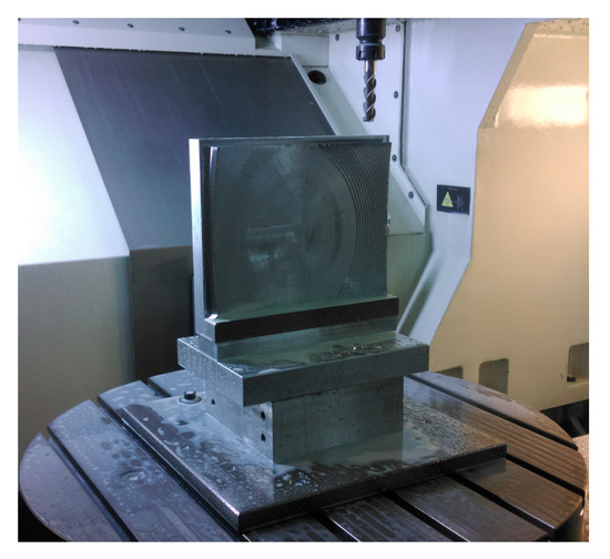The workpiece was machined by a five-axis precision machining center DMG HSC75 Linear (DMG, Bielefeld, Germany), the stroke range along x, y, and z axes are 750, 600, and 560 mm, respectively. The rotational range of C-axis is 360° and the rotational range of B-axis is −10~110°. Repositioning accuracy for three linear axes and two rotation axes were 3 μm and 5 arcseconds, respectively. Figure 5 shows the configuration of the experimental setup, where the workpiece was fixed on the rotation table. The machining of double freeform surface was completed in a single set-up for avoiding the positioning error due to the repeated clamping processes.