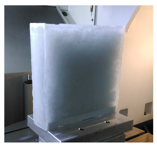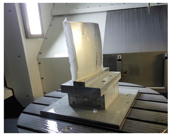 In the experiment, the workpiece was filled with paraffin after a rough machining process, as shown in Figure 8. The paraffin on one freeform surface was machined with a thickness 2 mm. After the finish process of one freeform surface, the workpiece is refilled with paraffin. Then, the paraffin on the other freeform surface was also machined with a thickness 2 mm. Semi-finish and finish machining process of the other freeform surface were completed, as Figure 9 shows. The whole process will completed after the paraffin removed. The parameters adopted in the experiment with paraffin filling were same as the experiment without paraffin filling.