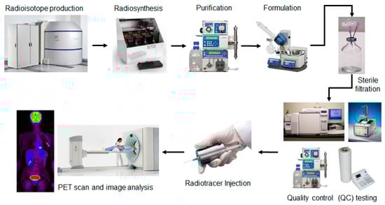 Positron emission tomography (PET) and single photon emission tomography (SPECT) are real-time, 3D imaging techniques that have unparalleled specificity and sensitivity for visualizing biochemical processes in living subjects [1,2]. The information from a PET or SPECT scan is used clinically in disease diagnosis, prediction of response to therapy, and monitoring of response to therapy [1,3,4,5,6,7]. PET is also an indispensable research tool for uncovering mechanisms of disease initiation and progression, developing new therapies, measuring and optimizing the pharmacokinetic properties of new therapeutic compounds, and evaluating new therapies in clinical trials [8]. PET and SPECT both rely on the injection of a radioisotope-labelled compound, known as a radiotracer or radiopharmaceutical, into the patient which targets specific receptors, enzymes, or proteins and allows their position and density/activity to be measured via radiation detectors during a PET or SPECT scan. PET employs radiotracers labelled with positron (β+)-emitting isotopes (e.g., F-18, C-11, O-15, N-13, Ga-68, Cu-64, Zr-89, etc.), which release positrons upon decay. These positrons rapidly annihilate with nearby electrons to form two anti-parallel gamma (γ) rays (511 keV each) that are detected by a ring of detectors [2]. SPECT typically utilizes radioisotopes that directly emit γ rays (e.g., Tc-99m, I-123, In-111, etc.) which are detected using a collimator and gamma camera [9]. In both cases, many decay events are detected to enable reconstruction of the three-dimensional radiotracer distribution in the body. Due to the short half-life of PET and SPECT radioisotopes, labeled tracers must be manufactured just prior to imaging (Figure 1). And because these compounds are injected into humans, there are strict regulatory requirements for performing quality control (QC) testing of the purified, formulated product of each batch that is produced, to ensure safety before they can be released for clinical use [10,11]. Specific procedures and requirements for these tests are described in regulatory documents published in each country or region (e.g., U.S. Pharmacopeia (USP) General Chapter <823> [12] and U.S. Food and Drug Administration (FDA) 21 CFR Part 212 [13]; European Pharmacopoeia (EP) [14], etc.). Procedures specific to the PET tracer 2-[18F]fluoro-2-deoxy-D-glucose ([18F]FDG) have been discussed in detail in several review articles [15,16]. In general, pharmaceutical tests (e.g., pH, color and clarity, chemical purity, residual solvents, pyrogenicity, sterility) are required to ensure physiological compatibility of the final preparation and the absence of microbiological, pyrogenic, chemical or particulate contamination. In addition, radioactive tests (e.g., radiochemical identity, radiochemical purity, radioisotope identity, radioisotope purity, and radioactivity concentration) are required to ensure there are no radioactive or radionuclidic impurities that could interfere with the biodistribution or imaging protocol and to ensure the proper patient dose [17].