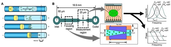 Microfluidic methods for detection of bacteria. (A) A microbial sample with “universal” fluorescent stain is concentrated by capillary electrophoresis to improve detection sensitivity. (BA = “blocking agent”). Adapted with permission from [50] Copyright © 2007 American Chemical Society. (B) Impedance-based bacterial detection chip. Cells are first focused via dielectrophoresis (DEP) to the center of channel for downstream detection. A detectable shift in resonant frequency and phase occur when a single cell or particle passes through the measurement area due to a change in the channel impedance. Adapted from [53] with permission of The Royal Society of Chemistry.