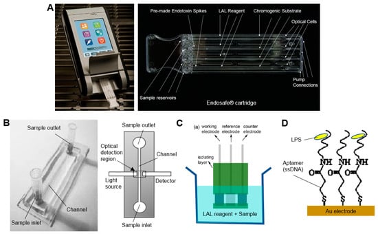 Examples of microfluidic devices for bacterial endotoxin test. (A) Commercial LAL assay system (Endosafe®, Charles River Laboratories, Inc.) comprising a portable, hand-held spectrometer (left) and ~25 mm × 75 mm disposable microfluidic cartridge (right). Adapted from [56]. (B) Photograph of microfluidic LAL test chip (left) and block diagram illustrating detection method (right). Sample mixed with chromogenic substrate is loaded into the microchannel and optical detection is performed in the middle of channel. Photograph adapted with permission from [57] Copyright © 2004 Springer. (C) Screen-printed electrodes for electrical-impedance monitoring of standard gel clot LAL assay. Adapted with permission from [58] Copyright © 2013 Elsevier. (D) Biosensor comprising a gold electrode functionalized with endotoxin-specific aptamer. Binding of endotoxin is detected via impedance spectroscopy. Adapted with permission from [60] Copyright © 2012 Elsevier.