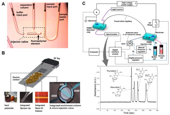 Miniaturization of HPLC is one approach that could potentially be used for microscale implementation of the chemical purity test, though it has not yet been demonstrated for radiopharmaceuticals. In “microchip HPLC”, the HPLC column, and often elements of the injection valve, are integrated into a microfluidic chip. One implementation uses trapped cylindrical plugs of polymer monolith (formed by in situ polymerization) that slide within cylindrical glass microchannels to inject samples into the on-chip polymer monolith column [64] (Figure 5A). Another implementation that has been commercialized (HPLC-chip, Agilent, Santa Clarita, CA, USA) includes an integrated micro-rotary injection valve with sample enrichment column serving as the injection loop. In this setup samples are injected into an integrated column, flowing to a downstream electrospray emitter to nebulize and transfer the sample to a mass spectrometric detector [65] (Figure 5B). A recent review discusses the wide range of available microchip HPLC systems [66]. With chip-based HPLC, sample volume and separation time are significantly reduced (usually nL to µL), as is the physical size of the separation medium. However, chip-based HPLC systems still rely on bulky instruments that house the high-pressure pumping system, injection valve actuator, and detection modules, though efforts are underway to shrink these other components as well [66,67].