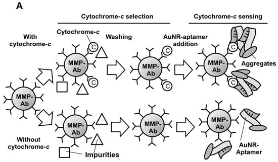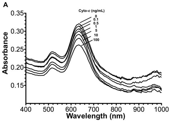 Cytochrome-c (Cyto-c) is a potential marker for diagnosing many diseases, such as myocardial infarction, and determining the effectiveness of cancer therapy [1,2]. During the process of programmed cell death (apoptosis) and/or necrosis, cyto-c is released rapidly in minutes from the mitochondria to the cytosol and to the extracellular environment in both in vitro and in vivo conditions [3,4]. Serum cyto-c concentrations have been reported as a good indicator to predict the survival rate of patients after resuscitation from cardiac arrest; to evaluate the conditions of trauma–hemorrhage induced hypoxia and organ dysfunction; to monitor the aging heart damage in healthy elderly; to serve as the danger-associated molecular patterns (DAMP); to assess the severity of organ damage; and to predict the prognosis in the patients with systemic inflammatory response syndrome/multiple organ dysfunction syndrome (SIRS/MODS) [5,6,7,8]. In all these examples, non-survivors were usually found with a high concentrations of cyto-c in their plasma. In cancer therapy, apoptosis is the primary process that eliminates cancer cells after drug treatment and the release of cyto-c from the mitochondria into the cytoplasm is an essential step and is regarded as a ‘point-of-no-return’ stage of apoptosis. Indeed, the serum level of cyto-c increased at the onset of chemotherapy, reached the peak with a median of two days, and decreased gradually during remission induction [9,10]. Therefore, the concentration of cyto-c found in the blood circulation correlates to the percentage of cancer cell death, i.e., the efficacy of the anti-cancer drug treatment [11,12].