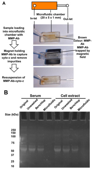 Use of a microfluidic chip to improve impurities removal. A schematic diagram and photos show the microfluidic chip with a reaction chamber in the dimension of 20 × 5 × 1 mm for holding MMPs during the fluidic flow under a fixed magnetic field (A). The gel photo shows a comparison of impurities removal between benchtop and microfluidic chip methods during cytochrome-c selection in serum and culture medium (B).