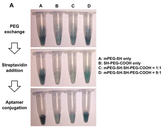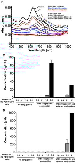 After the optimization of PEG ratio on AuNR conjugation, the quality of PEG-functionalized AuNRs on downstream functionalization with streptavidin and then the target aptamer was evaluated. Protein binding fluorescence SYPRO red dye was used to evaluate the amount of bound streptavidin protein, and DNA binding fluorescence SYBR safe dye was used to evaluate the amount of bound aptamer DNA. As expected, the previous optimized mPEG-SH:HS-PEG-COOH in a 9:1 ratio yielded the highest binding percentage of streptavidin and aptamer, compared with other ratios (Figure 3C,D). Theoretically, a higher binding percentage of streptavidin and aptamer should occur in a higher percentage of HS-PEG-COOH in PEG displacement, given that the free carboxyl group available is required for the EDC/NHS chemistry for conjugating the amino group in streptavidin. However, the high percentage of HS-PEG-COOH led to a higher loss of AuNR (Figure 3B). It is believed the positive charge on CTAB, similar to ionic salt, could attract the negatively-charged HS-PEG-COOH conjugated with AuNRs and lead to aggregation. However, CTAB cannot be fully removed prior to PEG displacement, as AuNRs will aggregate spontaneously without CTAB. The addition of mPEG-SH, a neutrally-charged PEG, could therefore reduce the aggregation during PEG conjugation, while a certain percentage of HS-PEG-COOH, in this case, a ratio of 9:1, retained the ability on AuNR functionalization with aptamer.