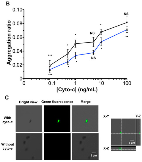 In order to confirm whether aggregation has taken place from aptamer-functionalized AuNRs localizing and binding on the MMP-Ab-cyto-c complex rather than MMP-Ab without cyto-c, we conjugated AuNRs with green fluorescence protein (GFP) as a tag. DNA binding dye was avoided in this case since the binding action of the dye on DNA double strands would affect the secondary structure of aptamer DNA, thus altering its binding ability on cyto-c. It was found that green fluorescence only appeared in MMP complex when cyto-c was present (Figure 4C). To further evaluate how well the coverage of AuNRs on MMP-Ab-cyto-c was, Z-axis scanning with a resolution of 200 nm was conducted with confocal microscopy. The X-Y-Z graph showed the full coverage of MMP-Ab-cyto-c in the 2 μm-size dot, shown in the right panel of Figure 4C.
