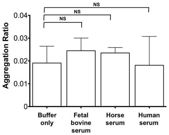 To sense the cyto-c in serum, we need to understand if any unwanted signals, which affect the LOD due to non-specific binding were found in a negative control in the serum. A standard solution of known cyto-c concentration in sera from different sources (e.g., fetal bovine, horse, and healthy human subjects) were prepared and used for cyto-c sensing. As expected, we did not see any significant difference of the cyto-c in sera when compared with that in buffer (Figure 5). In this context, we confirmed the utility of the AuNR-LSPR assay for cyto-c sensing in an environment with serum. Therefore, we can then proceed to the next step of the application.