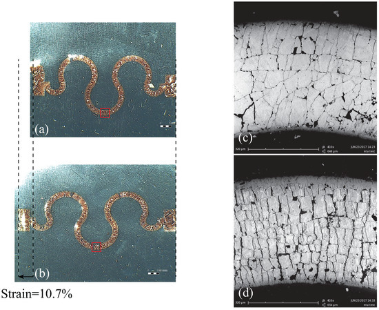Photographs of unit cell of stretchable horseshoe-shape frequency-selective surfaces obtained using optical microscope with 12× magnification: (a) without stretching and (b) with stretching [34]; (c,d) scanning-electron-microscope (SEM) images of meandered parts at 410× magnification (while stretching, patterns broke apart along cracks, which resulted in loss of conductivity).
