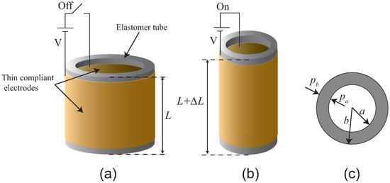 Under microscopic stretching and contraction, the distance between adjacent turns of the spring is relatively small when the cylindrical DEA is extended in the axial direction. The application of external electrical stimuli can result in an electric field uniformly distributed across the entire surface of the device. This is similar to the behavior of the tube actuator with thin compliant electrodes as shown in Figure 3. Thus, we assumed that the proposed spring-based cylindrical actuator could be modeled using the theoretical model of the tube actuator. As shown in Figure 3a, without application of external electrical excitation, the tube actuator maintains its original length, L. Under application of external voltage, V, the tube actuator deforms, such that the length is increased to . Based on the electromechanical model of the tube actuator in [12], the inner pressure, , applied to the inner surface of the tube by the compliant electrodes can be expressed as follows: