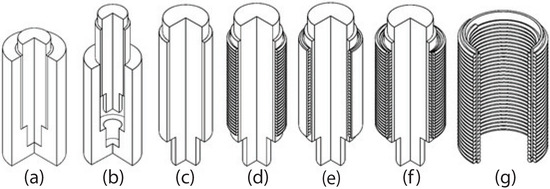 Figure 4a–g show the process used in the fabrication of the proposed cylindrical DEA. As shown in Figure 4a, a mold that includes an axle and a barrel is first created by 3D printing or machining.