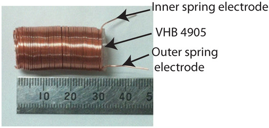 In this research, we adopted metallic springs as compliant electrodes for cylindrical DEAs to provide low resistance and stiffness under the effects of deformation. This design was inspired by the extensibility of mechanical springs. The proposed cylindrical DEA comprises a VHB 4905 (3M Company, Maplewood, MN, USA) thin film folded into a hollow tube and sandwiched between two individual copper springs inside and outside. VHBs are acrylic polymers widely used as dielectric elastomers with large expansion exceeding 100% strain [35,36] and high electrical breakdown strength [29]. Under external electrical stimuli, the proposed cylindrical DEAs provide axial deformation (stretches and contractions) similar to the linear-motion behavior of tube-like DEAs. The main advantage of the proposed spring-based compliant electrodes is the fact that they remain conductive and do not increase in stiffness throughout their range of motion. Preliminary work on this topic was reported in [37].