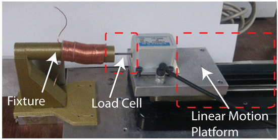 Figure 6 presents the experimental testbed used to characterize the mechanical properties of the cylindrical DEA. The device being tested was placed with one end fixed and the other end in contact with a load cell mounted on a moving platform. The force applied to the DEA and the deformations in the DEA induced by moving the platform could be measured using the load cell with the distance moved by the platform.