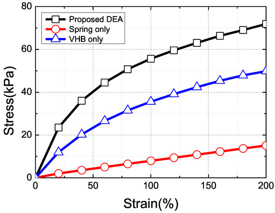 We obtained stress-strain relation of the fabricated cylindrical DEA by measuring the axial strain under axial loads, as shown in Figure 7. The stress was defined as the force per unit area and the strain was defined as the ratio of the extended length to the original length. The elastic coefficient of the cylindrical DEA is a combination of the elastic coefficients of the dielectric elastomer and the compliant electrodes; therefore, we examined the individual stress-strain relationships of the VHB film and copper spring separately, as showed in Figure 7.