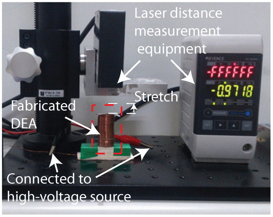 Experiment setup used to characterize electromechanical properties of dielectric DEA: device placed vertically and connected to variable voltage source of 9.9 kV; under application of external voltage, device extended vertically and axial deformations measured using laser-based distance measurement device.