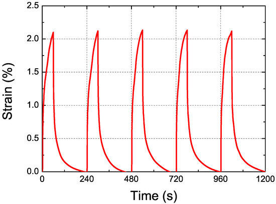 Figure 9 presents the measured axial strain in the proposed cylindrical DEA in the time domain. Under high voltage excitation during the first 60 s of each cycle, the cylindrical DEA extended to its maximum. When the applied voltage was removed in the last 180 s of each cycle, the cylindrical DEA returned to its original shape. The same behaviors were observed in other cycles; i.e., the cylindrical DEA extended when external voltage was applied and contracted when the external voltage was removed. The strain-time response was a periodic function indicating that the proposed cylindrical DEA provides consistent extensions and contractions.