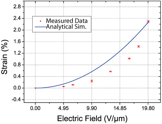 Simulated and measured axial strain values in proposed cylindrical DEA under external electrical stimuli ranging from 0 V to 9.9 kV, which corresponds to an electric field ranging from 0 to 19.8 V/m (curve indicates simulation results obtained using the theoretical model described in Section 2.2; red points indicate average measured strain values and error bars indicate one standard deviation).
