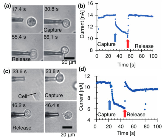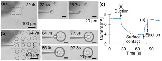 Optical observation is a common method to obtain the locations and motions of objects. It is possible to automatically detect the capture of a single cell under microscope observation [14,16,19,20]. The capture of a cell can be determined by the cessation of the relative motion between the cell and a holder. Time-series microscope images contain 4D information (horizontal and vertical pixels, gray scale intensity, and time), which is often excessive. It is costly and complicated to process time-series microscope images. To help with the detection of a single cell, a different signal with a higher signal-to-noise (S/N) ratio is preferable. It is effective to use a time-series ionic current through a hollow channel, which provides 2D information containing the current and time. This current is more sensitive to the state of a tip opening. Therefore, the S/N ratio of the ionic current is higher than that of the optical method. A current has been used for measuring the electrophysiological activities of membrane channels, which is called the ‘patch-clamp technique’ [21,22], and for determining a surface topography, which is called ‘scanning ion-conductance microscopy’ [23,24,25,26]. Current measurement was applied to understand the insertion state of a needle in a single cell [27,28,29]. However, this current measurement method has never been extended to the field of single cell manipulation before. Establishing optimum conditions for achieving less-invasive and high release rates of an electrical measurement and pick-up and release method is desired. The application of the electrical detection method is expected to improve the robustness of cell manipulation.