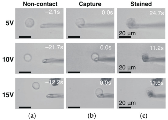 We set a DC applied voltage to +5, 10, and 15 V in a higher range and manipulated a cell at a constant suction pressure of −5 kPa. The major motivation of using higher voltage was to investigate the possibility in removal of a high-gain amplifier and simplification of the electrical measurement. The damage to the cell membrane was evaluated by staining the cell with a trypan blue solution (Figure 3). We used pipettes with I.D. of 3.3 µm and 4.5 µm. At 5 VDC, 6/7 and 1/7 cells were stained within 25 s and at 83 s from cell capture, respectively. At 10 V, 5/5 cells were stained within 15 s. At 15 V, 2/2 cells were stained within 12 s. The total number of intact cells was 0/14 (=0%). Although the time of the cell staining was the longest at +5 V among the three voltage conditions, 25 s or tens of seconds at 5 V was not sufficiently long for cell manipulation.