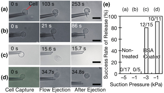 Release rates of cells from tips of (a,b) non-coated and (c,d) BSA coated pipettes. The concentration of cells was 2.94 × 105 cells/mL. Measurement results of cell release after its capture on the tip (e).The experimental conditions for (a–d) are listed in Table 1.