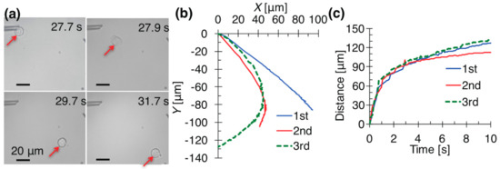 The trace of a cell ejected from a pipette (Video S2) was measured to reduce the placement error of a cell in a microwell (Figure 5). An ejection at +5 kPa generated a continuous flow from a tip and transported a cell along the flow. The travel direction of the cell was affected by the opening of the tip and a flow disturbance. The origin of the X–Y coordinates was set at the tip of the pipette. We measured the distance of the cell from the origin. The same pipette moved single cells to the lower right (Figure 5b). The angle of the opening affected the cellular motion, because the flow and pressure were generated according to the direction of the opening. The third cell in Figure 5 changed its direction to the lower left. A flow disturbance to the left was generated.