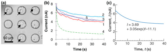 Formation of letter ‘T’ by picking up and placing five cells in microwells using pipette. (a) Micrograph of the five placed cells; (b) five current curves versus time from cell capture. Current no. 1 is also shown in Figure 6; (c) averaged curve of the five fitted curves using . A = 3.69 ± 1.30 (nA), B = 3.05 ± 1.05 (nA), and C = −11.1 ± 5.47 (s) (n = 5).