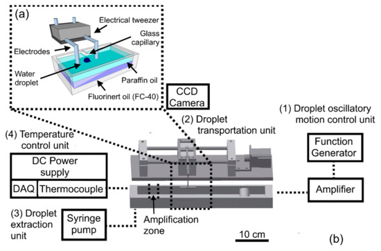 The experimental setup (Figure 1b) mainly consists of four parts: (1) Droplet oscillatory motion control unit; (2) Droplet transportation unit; (3) Droplet extraction unit; and (4) Temperature control unit. The droplet oscillatory motion was visualized and recorded by a charge-coupled device (CCD) camera (Coolpix P6000, Nikon, Melville, NY, USA) mounted on a microscope. The electric potential was applied by a function generator (AFG 3022B, Tektronix, Inc., Beaverton, OR, USA) and amplified with a high-voltage amplifier (Trek 10/10B-HS, Trek, Inc., Lockport, NY, USA). One electrode of the tweezer was the source electrode (high-voltage electrode) while, the second was grounded. To characterize the droplet transportation, the electrical tweezer was mounted on the motorized linear stage (fabricated in-house) and was moved ~20 cm. The linear motorized stage was powered by direct current (DC) power supply (E3617A, Agilent Technologies, Inc., Santa Clara, CA, USA). Additionally, a syringe pump (KD Scientific, Inc., Holliston, MA, USA) was used only to inject water samples through the glass capillary (Microhematocrit Capillary Tubes, Fisher Scientific, Pittsburgh, PA, USA) at the interface of the two-oil medium to study the droplet extraction while, droplets were dispensed by the pipette in the oil medium for all other characterization experiments. Finally, a heating element, fabricated in-house using a resistive wire (NI80, Omega Engineering, Inc., Norwalk CT, USA), powered by the DC power supply (GPS-1850D, Good Will Instrument Co., Ltd., Taiwan) was used to establish the elevated temperature zone (~65 °C) in the oil chamber. The temperature was controlled by LabVIEW (V 14.0.0, National Instruments, Austin, TX, USA) with a PID module that was connected to the heat generation and data acquisition units through the DAQ (NI-6008, OMEGA Engineering, Inc., Houston, TX, USA). Thermocouple (TMQSS-020U-12, OMEGA Engineering, Inc., Houston, TX, USA), A signal conditioner (Omega-CCT) provided feedback to control the temperature.