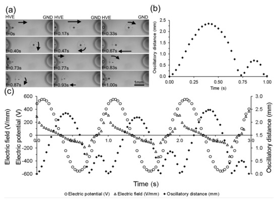 Droplet oscillatory motion with the high-voltage electrode under the influence of applied sinusoidal electric potential: (a) Sequential images of droplet motion with high-voltage electrode for one frequency cycle of applied potential of 560 V at 1 Hz; (b) oscillatory trip of droplet for the one frequency cycle of applied potential of 560 V at 1 Hz with the high-voltage electrode; (c) the droplet oscillatory motion synchronized with the applied sinusoidal voltage and electric field. Applied sinusoidal electric potential (○), sinusoidal electric field (Δ), Oscillatory distance (◊).