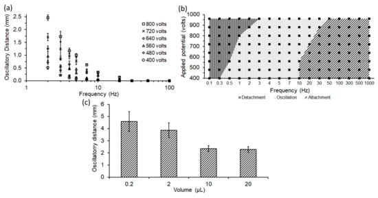 Characterization of water droplet (0.3 µL) motion with the high voltage electrode of electrical tweezer (electrodes 4 mm apart): (a) Maximum oscillatory distance of water droplet with the high-voltage electrode for tested range of frequencies (2–100 Hz) and for applied maximum sinusoidal electric potential (400–800 V); (b) electrical parameters to select the type of droplet motion with a high-voltage electrode under the tested range of frequencies (0.1–1000 Hz) and applied maximum sinusoidal electric potential (400–960 V); (c) dependence of oscillatory distance of water droplet with the high-voltage electrode for various droplet volumes (0.2, 2, 10, 20 µL), under the electric potential of 640 V (V/d = 160 V/mm) at 2 Hz.
