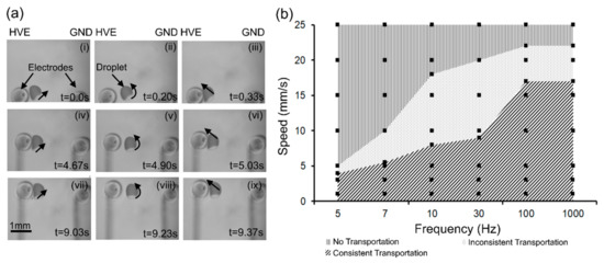 The utilization of electrical tweezer for the droplet transportation: (a) Sequential images (i–ix) illustrates the droplet transportation meanwhile the droplet is oscillating with the high-voltage electrode under the influence of electric potential of 480 V (V/d = 120 V/mm) at 3 Hz; (b) the characterization of droplet transportation with the electrical tweezer (electrodes 10 mm apart), under the influence of electric potential of 2000 V (V/d = 200 V/mm) at 5 Hz, is categorized into three regions; (i) no transportation, (ii) inconsistent transportation, and (iii) consistent transportation.