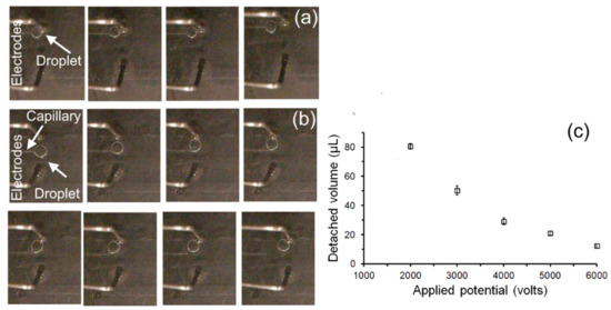 In the case when no electric field was applied (Figure 5a), the electrical tweezer was not able to dislodge the emerging droplet from the tip of the capillary even when physical contact between the electrode of the tweezer and the droplet was made. However, with an electric potential 2000 V of (V/d = 200 V/mm) at 5 Hz, the emerging droplet was first attracted to the high-voltage electrode and then moves with the electrode as it is moved away from the capillary (Figure 5b).