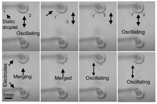 Merging of droplets is crucial to mix reagents in microfluidics. To demonstrate droplets merging, an electric potential of 560 V (V/d = 140 V/mm) at 2 Hz was applied to the electrical tweezer (electrodes 4 mm apart). The first droplet (0.3 µL) was dispensed at the interface of the bi-layer dielectric medium between the electrodes, while the second droplet (0.3 µL) was positioned at the small distance (~5 cm) from the tweezers. The sequential images in Figure 6 demonstrate the merging of two droplets. It shows the tweezers transporting an oscillatory droplet to another static droplet and their eventual merging. The droplet (2) gets polarized under the influence of the electric potential and acquires charge by contact with the high-voltage electrode.