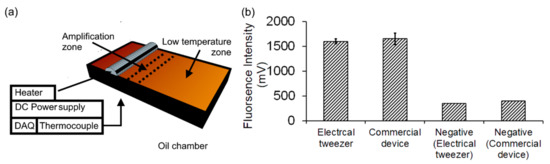 Loop-mediated isothermal amplification of DNA by electrical tweezers: (a) Schematics of bi-layer oil chamber for DNA amplification; (b) comparison of end- point fluorescence intensity of positive samples by electrical tweezers and fluorescence reader (ESE-Quant Tube scanner) with the negative control at ~65 °C.