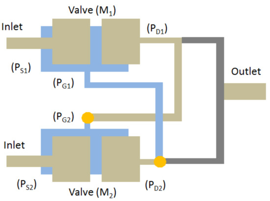 11] to achieve a low constant opening threshold pressure, the various regions of two similar microvalves are interconnected. Fluid flow between these different regions creates pressure fluctuations in the microvalve to control the structural membrane deformation. This process is performed with the microvalve in an open and closed state. For example, the source regions (PS) (inlet regions) of two similar microvalves (named