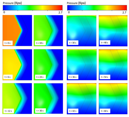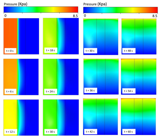 The inlet is connected to the source regions (PS) of microvalves and . The flow to these microvalves is independent. For example, if the inlet of microvalve is open, then the inlet of microvalve is closed. If the fluid flow through the input of microvalve () creates pressure in the source region, and the developed pressure in that region is applied over the upper surface of the structural membrane. Then, pressures on the surface on the membrane deflect downward and make way for fluid to flow from the inlet () to the outlet (). This phenomenon is called the open state of the microvalve. Simultaneously, per the interconnections, the flow from the drain region () outlet is connected to the gate region (). This process creates pressure in the gate region () in microvalve and forces the membrane to deflect upward. This process is called the closed state of the membrane. This interconnection method operates as a cyclic process. In FSI analysis, a working procedure identical to that above from an experimental analysis is applied. To reduce the computational overhead , just microvalve is taken and analysis is performed in complete cycle. The complete cycle takes around 60 s to transform from the open to closed state of a lone microvalve. Therefore, during the analysis, the first 30 s the inlet flow is sent to the top region of the microvalve to perform the open-state process. Similarly, the last 30 s of the flow is sent to the bottom region of the microvalve for the closed-state process. Finally, the performance of microvalve and the behavior of the structural membrane are examined, and the results are given below.