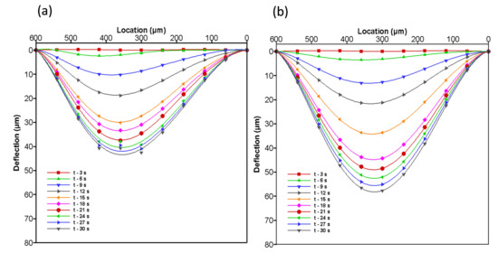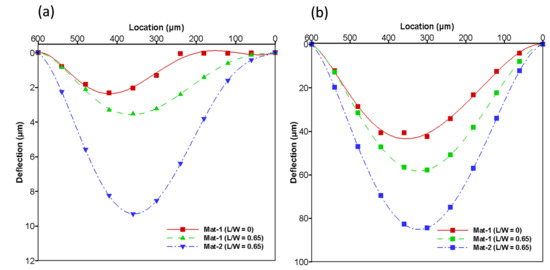 Figure 2, an increase in the L/W ratio separates the volumes of the source and drain regions. Therefore, in higher-L/W models, the source region has a large volume, and simultaneously the drain region will have a lower volume. The separation in region volumes creates a greater pressure difference in the source region; hence, quick deflection in the structural membrane is achieved.