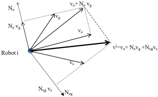 In order for the robot to perform the above tasks, the supervisor selects the priority of the tasks. In this study, the priority of the tasks in order is: Avoiding obstacles, moving to the destination, and maintaining the swarm. Assume that the obstacles are static and are known then the speed vector of each robot based on the null- space behavioral control technique [36] is calculated according to Figure 4.